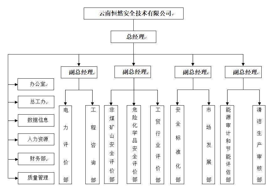 公司依据业务需要设有:电力评价部、工程咨询部、工贸行业评价部、危化行业评价部、非煤矿山评价部、安全标准化部、市场开发部、清洁生产审核部,能源审计和节能评估部、总工办、质量管理部、人力资源部、数据信息部、财务部和公司办公室共十五个部室。